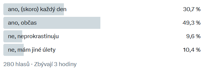 Má i vaše prokrastinace sexuální podobu? Zatěžuje vás to? Zkoušeli jste to někdy omezit? Ptala jsem se na síti X a dopadlo to asi tak nějak. (výsledky před koncem hlasování)