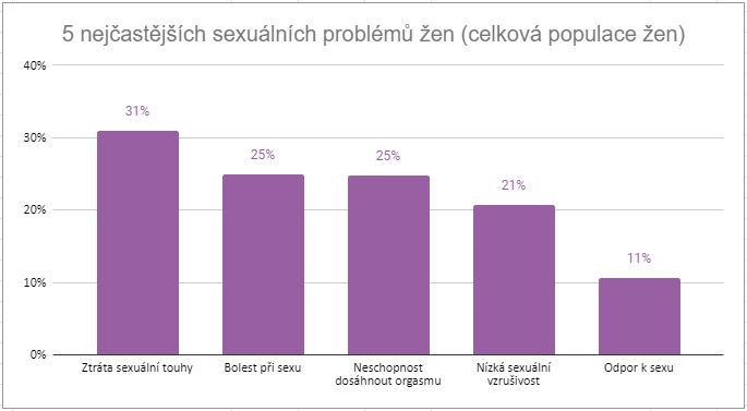 Když jsme u žen, upozorním tu ještě na jeden zajímavý graf. Čím nejčastěji trpí české ženy z oblasti sexuality? Data z průzkumu sexshopu Růžový slon najdete na webu Grálu až na dně textu o orgasmické konferenci, kterou Slon nedávno pořádal.