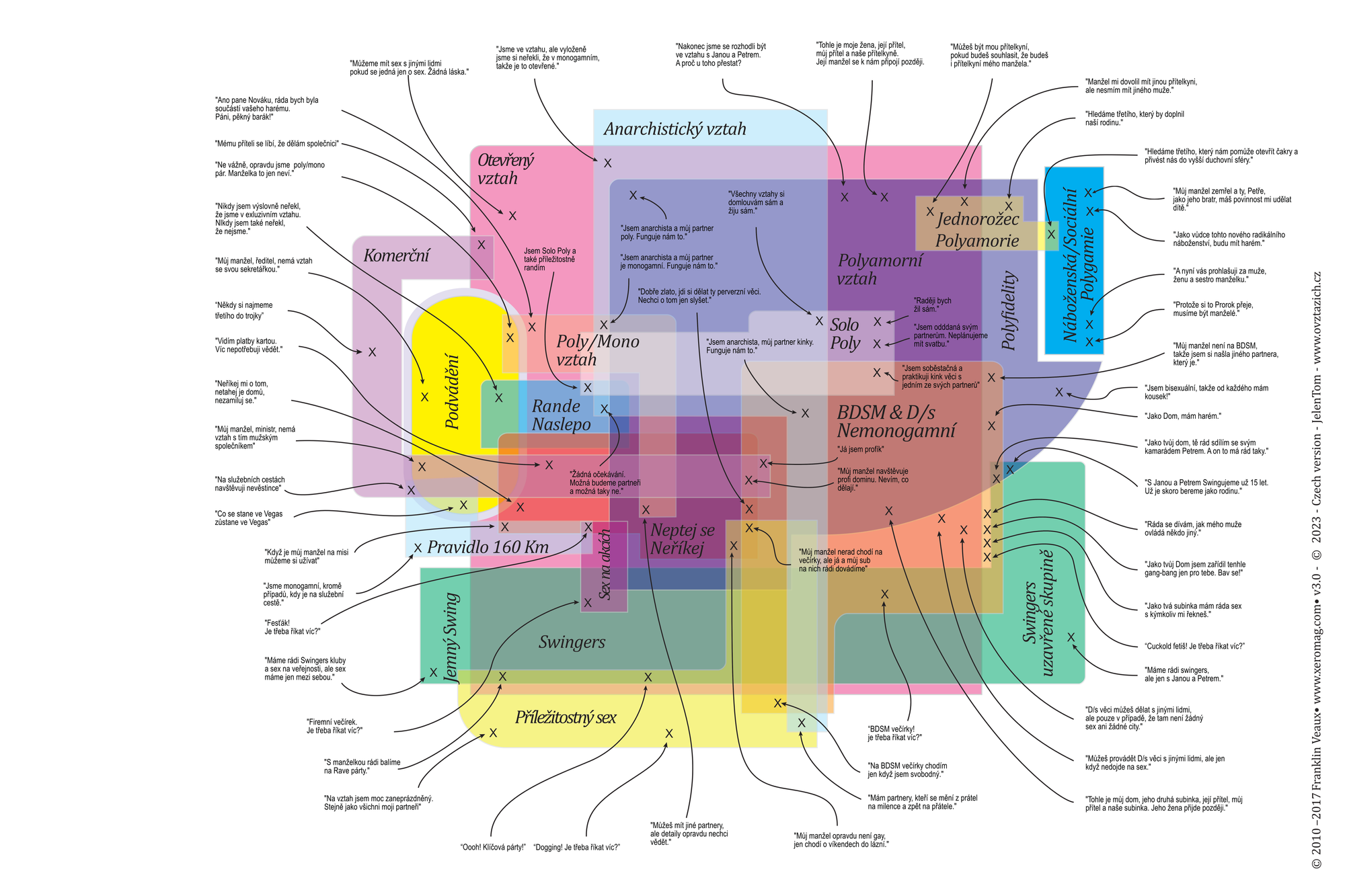 Vztahy mohou mít mraky podob a tato mapa dává velký, i když chaotický, přehled o těch, které nejsou standardní. Autorem je Franklin Veaux, autor knihy Více než dva, a do češtiny ji přeložil JelenTom - pro svůj web O vztazích. Tam píše o všech aspektech etické nemonogamie. Doporučuju a vzkazuju: Web hledá další pohledy na věc. Ozvěte se JelenTomovi!